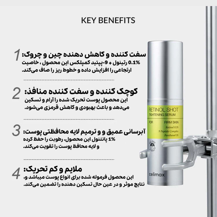 این سرم با ترکیب ۰.۱٪ رتینول خالص، کمپلکس ۹ پپتید و ۱٪ پنتنول طراحی شده تا پوست را سفتتر، صافتر و جوانتر نشان دهد.