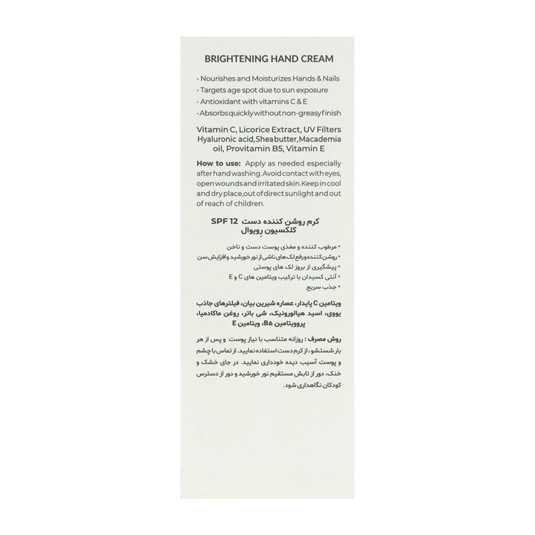 آلانتوئین با خاصیت تسکیندهنده و ویتامین E با خاصیت آنتیاکسیدانی و نرمکننده پوست از دیگر ترکیبات کرم روشنکننده دست رویوال هستند.